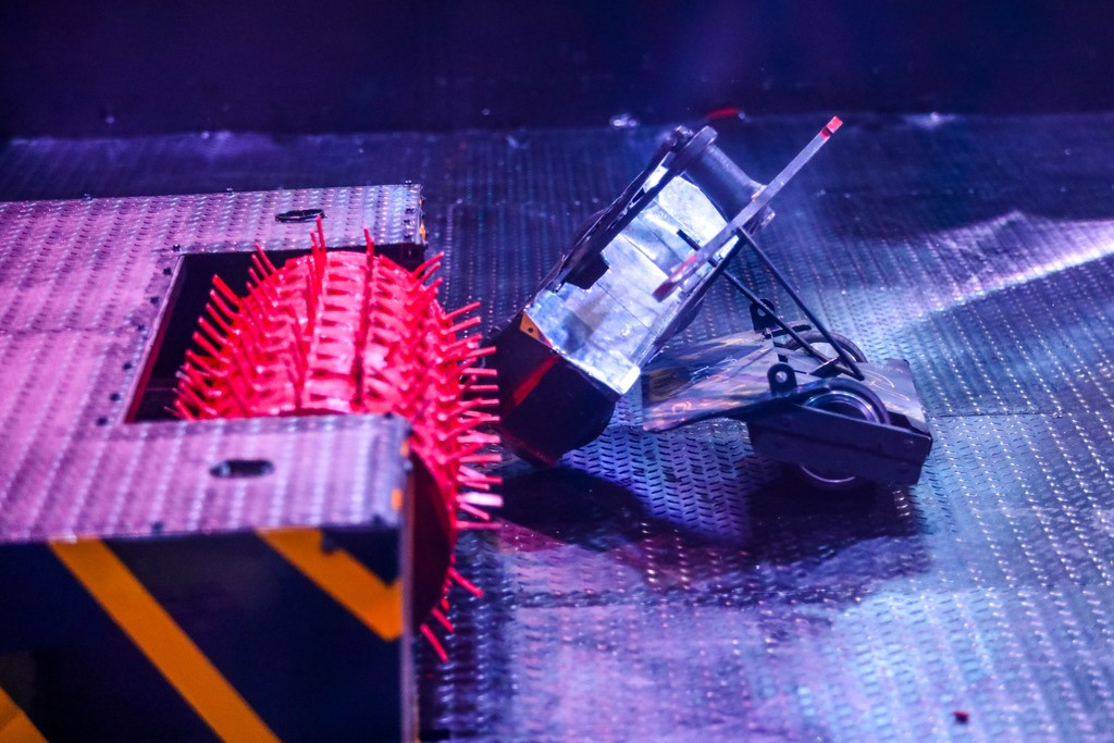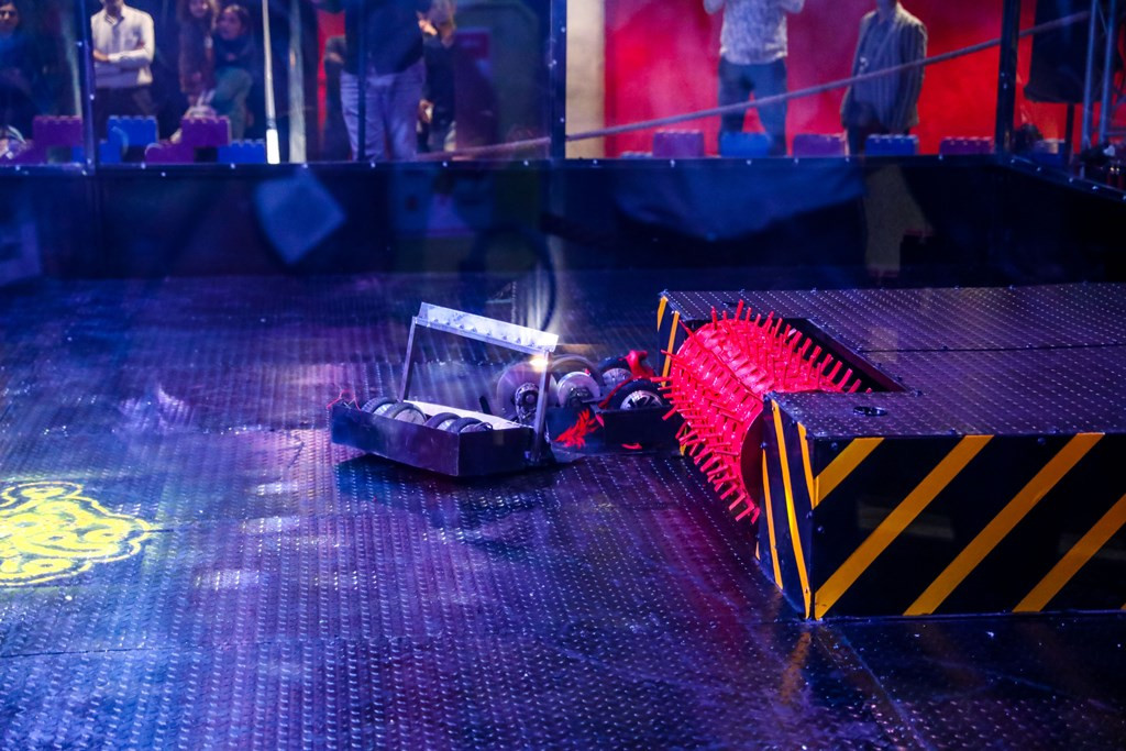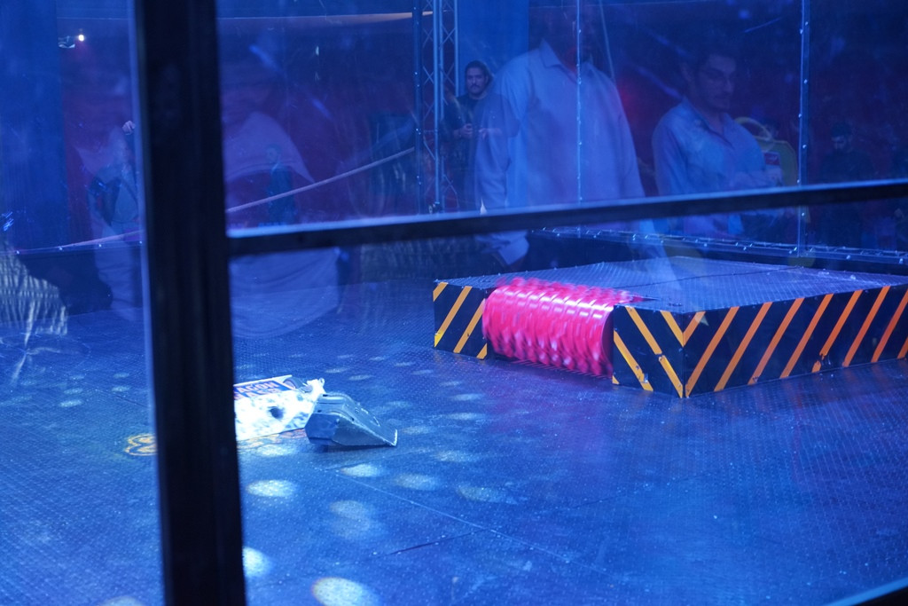 - المباراة 5: “بلاك تورنادو”، المصمم للسرعة والرفع المدمر بمحركات وبطاريات السكوتر، واجه روبوت الجامعة المائل في مواجهة مثيرة.