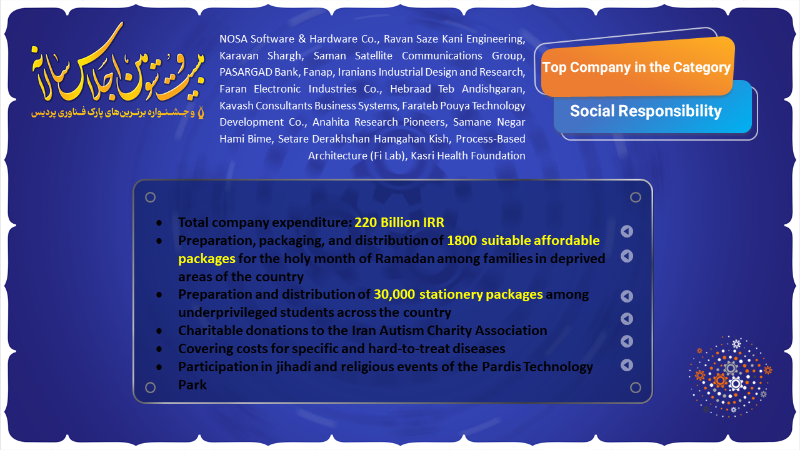 تم تكريم 22 شركة، منها نوسا، راون سازه، كاني كافان شرق، وفاناب، على مشاريع مجتمعية بارزة مثل توزيع 2,500 سلة غذائية في رمضان، وتوفير 30 ألف حقيبة لوازم مدرسية للطلاب المحتاجين، وتغطية تكاليف علاج المرضى المصابين بأمراض نادرة، والمشاركة في فعاليات ثقافية وخيرية.