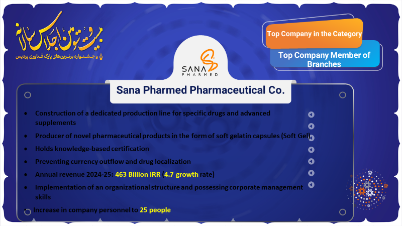 - جائزة فروع المنتزه – شركة داروسازان سانا فارمد أنشأت خط إنتاج مخصص للأدوية الجيلاتينية الطرية (سافت جيل)، ونجحت في توطين أدوية خاصة، وحققت زيادة في الإيرادات بمعدل 4.7 مرة.