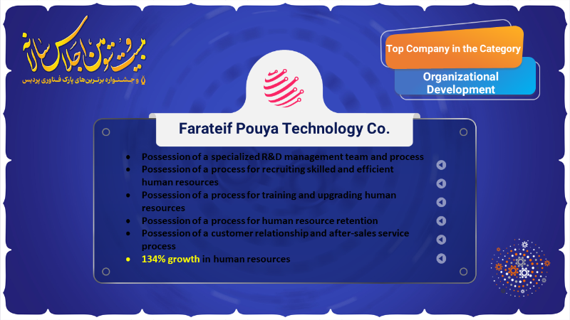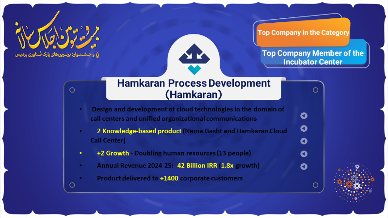 - جائزة مركز تطوير تكنولوجيا النخب – شركة طرح وتوسعة پردازش همكاران زادت عدد موظفيها بأكثر من الضعف، ونمت إيراداتها بنسبة 80%، وقدمت حلول مراكز اتصال سحابية لأكثر من 1,400 عميل من المؤسسات.