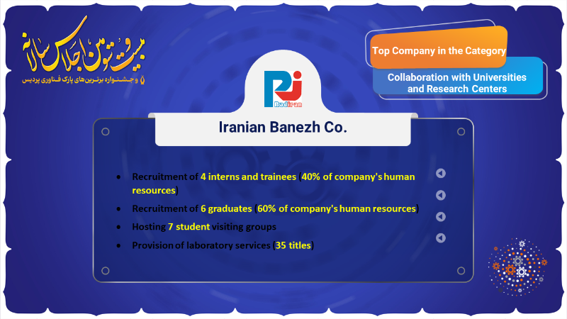 - جائزة التعاون مع الجامعات – شركة إيرانيان بانژ وظّفت 40% من كوادرها من طلاب التدريب و60% من الخريجين المتخصصين، واستضافت سبع زيارات جامعية وقدمت 35 خدمة مخبرية وورش عمل.