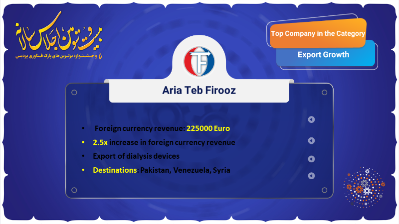 - جائزة التميز في التصدير – شركة آريا طب فيروز، منتجة أجهزة غسيل الكلى، زادت إيراداتها بالعملات الأجنبية بمعدل 2.5 مرة مع صادرات إلى باكستان وفنزويلا وسوريا.