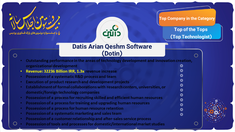 نال جائزة الابتكار لهذا العام شركة داتيس أريان قشم (داتين)، وهي شركة برمجيات تميّزت في تطوير التكنولوجيا وابتكار الحلول. من أبرز إنجازاتها نمو الإيرادات بمعدل 1.3 مرة، وتشكيل فريق بحث وتطوير متقدم، وتنفيذ مشاريع تطوير منتجات جديدة، والتعاون مع مراكز بحث وشركات ابتكارية محلية ودولية.