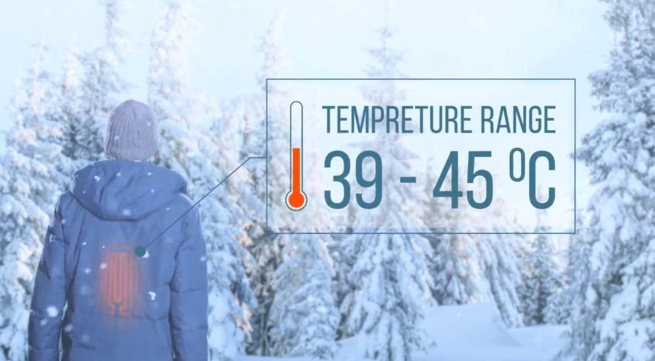أطقم التدفئة المرنة والمطبوعة هذه مصنوعة باستخدام حبر موصل نانوي. عند توصيلها بمصدر طاقة، يمكنها الحفاظ على درجة حرارة مريحة تصل إلى 45 درجة مئوية. تشمل الميزات الرئيسية توفير حرارة ثابتة لمدة تصل إلى 12 ساعة عند توصيلها ببطارية خارجية (باور بانك) بسعة 20,000 مللي أمبير، وتوليد حرارة فوري، وإمكانية الغسيل.