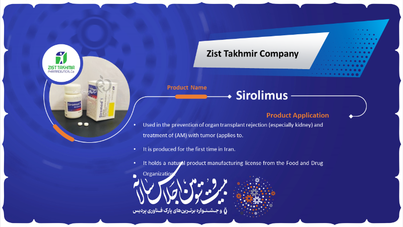 - سيروليموس – من إنتاج شركة زيست تخمير، دواء يمنع رفض زراعة الأعضاء ويعالج أمراضاً نادرة مثل تليّف العضلات الملساء الرئوية والأورام الحميدة مثل الورم الوعائي الشحمي لدى مرضى التصلب الحدبي.